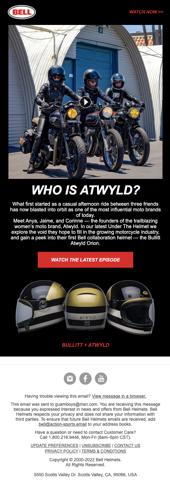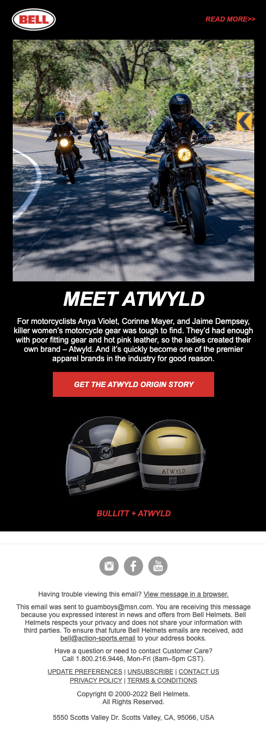 These emails were for Bell Helmets marketing purposes showing; new helmets, collaborations and discount incentives for customers. We used two styles of email templates; first the black background design to make the images pop. But soon dialed it back to a simplistic white background where we focused on the header images with a tear and page distress, trying to replicate an old print magazine ad.